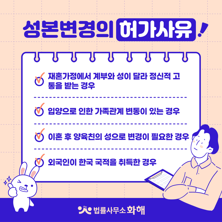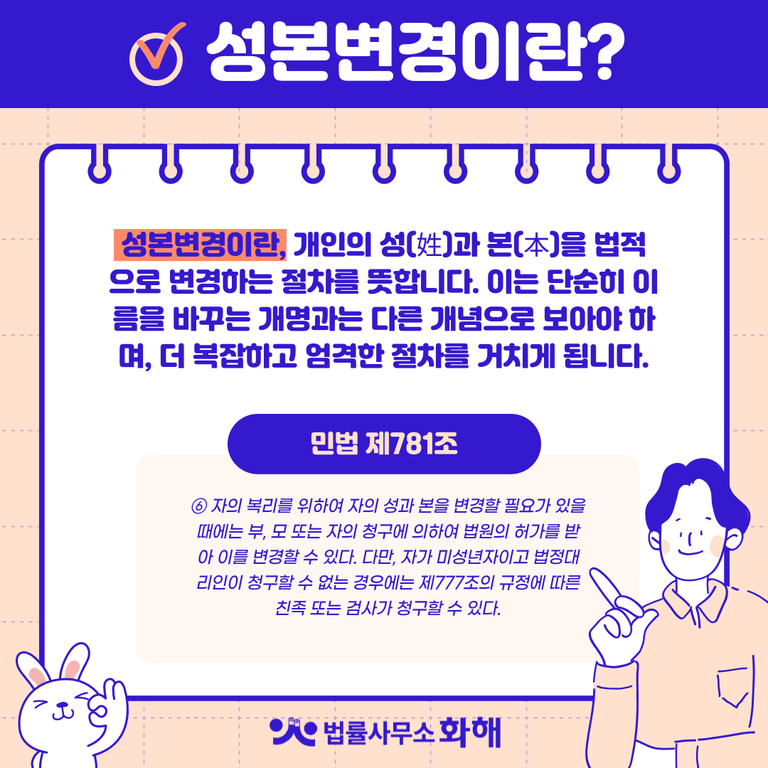 누구나 한 번쯤 이런 생각을 해보셨을 겁니다. 그러나 이름만 바꾸는 '개명'은 비교적 수월하지만, 과연 성을 바꾸는 것이 법적으로 가능할까요? 네, 가능합니다. 이 절차를 '성본변경'이라고 하는데요. 부모님의 재혼으로 새아버지의 성을 따라야 하는 상황이 온다던가, 이혼 후 홀로 자녀를 양육하게 된 엄마가 자신의 성으로 자녀의 성을 바꾸고 싶어 하는 등 여러 사정으로 인해 성본변경을 신청하는 경우가 생각보다 많습니다.