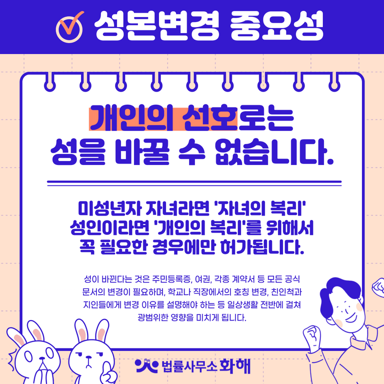 반드시 염두해 두셔야 할 점은 성본변경이 단순한 개인의 선호로는 바꿀 수 없으며, '자녀의 복리'를 위해 꼭 필요한 경우에만 허가된다는 점인데요. 성본변경은 단순한 문서상의 변경이 아니라, 개인의 정체성과 직결되는 매우 중대한 사안이기 때문입니다.