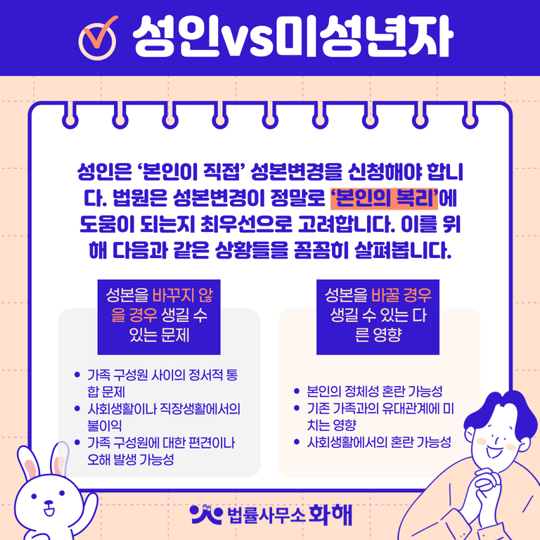 또 이러한 성본변경은 절차가 상당히 복잡하고 까다로운 편인데요. 특히 어린 나이의 미성년자와 이미 현재의 성으로 오랜 시간 정체성을 형성해 온 성인의 경우 그 허가 가능성과 절차의 난이도가 크게 차이가 납니다. 오늘은 성본변경 전문 화해와 함께 성을 바꾸는 절차에는 어떤 자격요건을 갖춰야 하며, 어떤 경우에 성본변경이 허가되는지, 그리고 성인과 미성년자 성본변경에는 어떤 차이가 있는지 등에 관해 자세히 파헤쳐 보겠습니다.