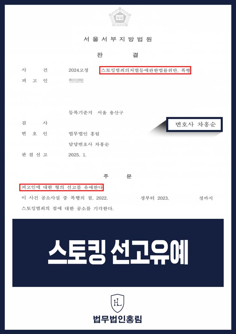그 결과 재판부에서는 혐의가 인정되지만 변호인의 의견을 받아들여 사건을 '스토킹 선고유예' 처리 하였습니다.