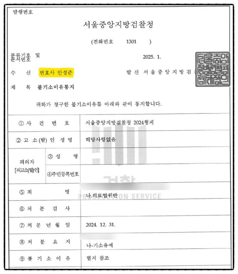 이처럼 의뢰인은 중한 처벌이 예상되는 범죄행위에 대하여 기소를 유예한다는 불기소 결정을받게 되었습니다.