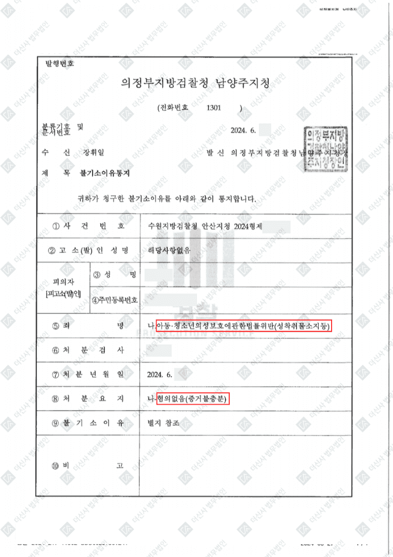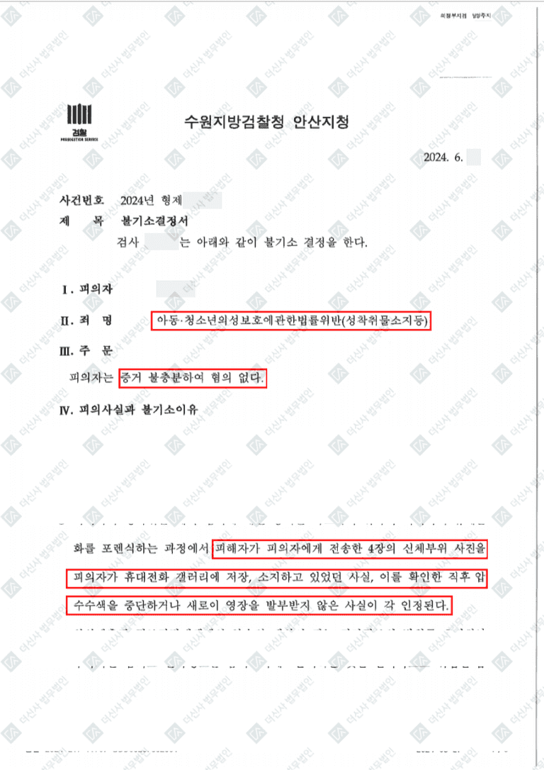 혐의 | 아동 · 청소년의성보호에관한법률위반(성착취물소지등)