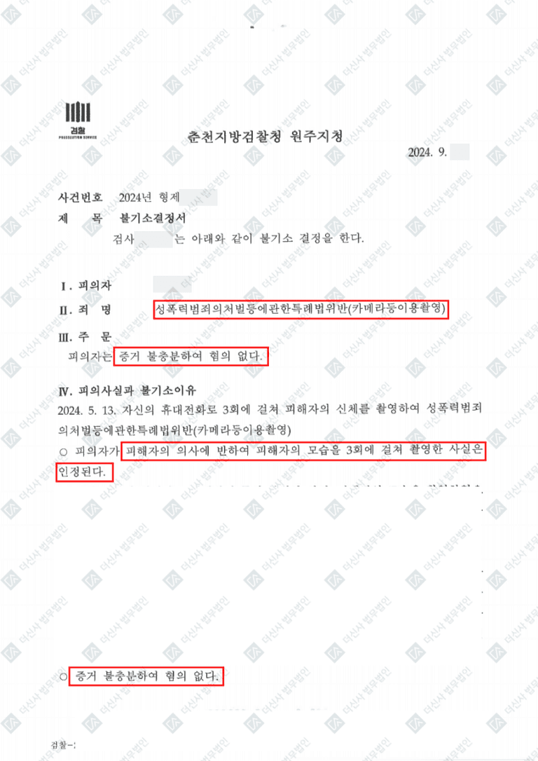 카촬죄와 같은 디지털성범죄의 경우, 증거가 명백한 경우가 많습니다. 해당 사건 역시 의뢰인이 개인적으로 대응하였다면 사안이 인정되어 처벌을 받을 수 있는 상황이었지만 더신사의 성범죄 대응 솔루션을 통해 이와 같은 결과를 만들 수 있었습니다. 만약 언제든 이와 유사한 상황에 처하셨다면 상담예약 남겨주세요. 연락드려 구체적인 성공사례 제시를 통해 사건 해결에 도움을 드리겠습니다.