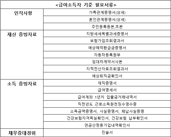 개인회생을 신청할 때에는 인적사항, 채무에 관한 서류, 재산, 소득에 관한 서류 등이 필요합니다. 자세한 서류는 아래와 같습니다.