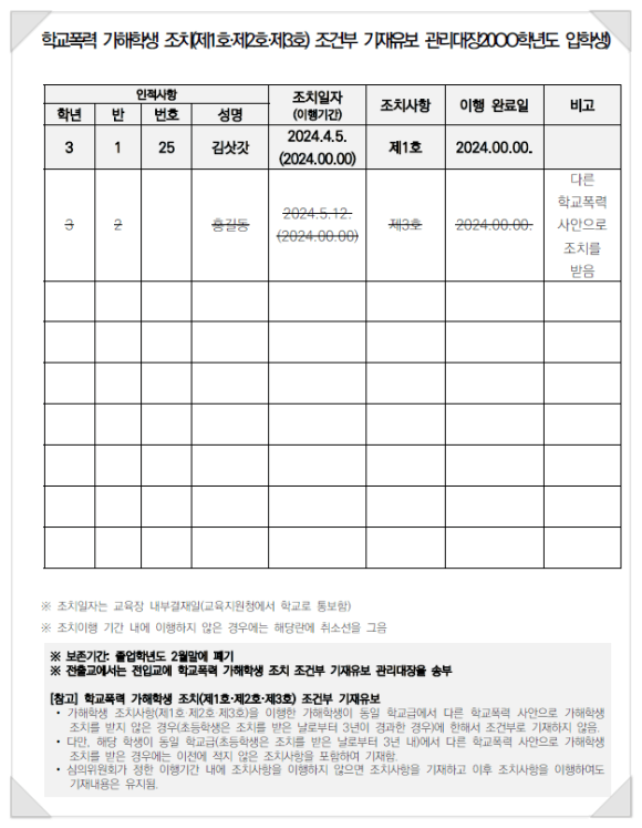 기재유보 사항은 학교폭력 가해학생 조치(제1호, 제2호, 제3호)