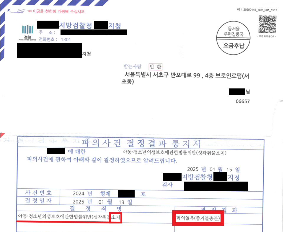 A는 수사 초기에 저를 선임하여 다행히도 위 10개의 허위 고소 모두에 대해 불송치 처분을 받았습니다. 하지만 담당 수사관이 어이없게도 성착취물 '소지'라는 엉뚱한 죄명으로 송치해버렸습니다. 이에 저는 검사에게 '소지의 위법성도 조각된다'는 취지의 3차 의견서를 제출하여 불기소 처분을 받아내는 데 성공하였습니다.