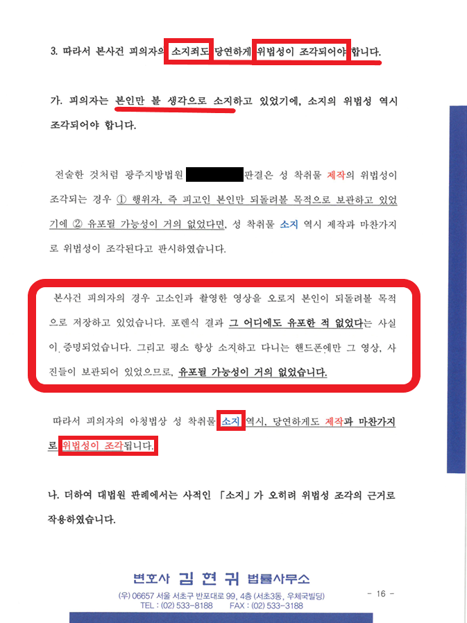 이 사건을 수사한 경찰은, 아동청소년 성 착취물 제작은 불송치하였으나, 엉뚱하게도 소지는 인정된다고 보아 송치하였습니다. 저는 해당 경찰 수사관에게 "제작에 소지가 흡수된다는 점, 따라서 제작의 위법성이 조각되어 처벌되지 않을 경우 소지도 마찬가지로 처벌안된다는 점"을 수차례 설명하고 의견서로도 제출하였습니다.