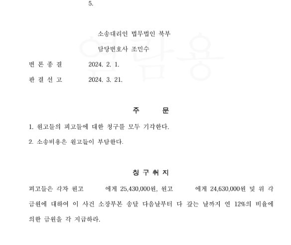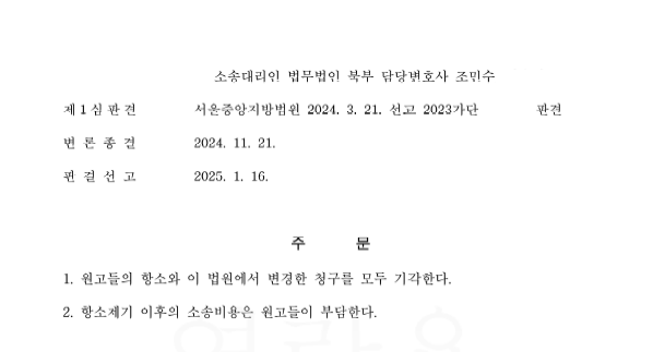 서울중앙지방법원은 본 변호사의 의견을 그대로 수용하여 상대방의 청구를 전부 기각하였음. 이후 상대방은 불복하며 항소하였으나, 본 변호사의 적극적인 방어로 상대방의 항소까지 기각시킬 수 있었음.