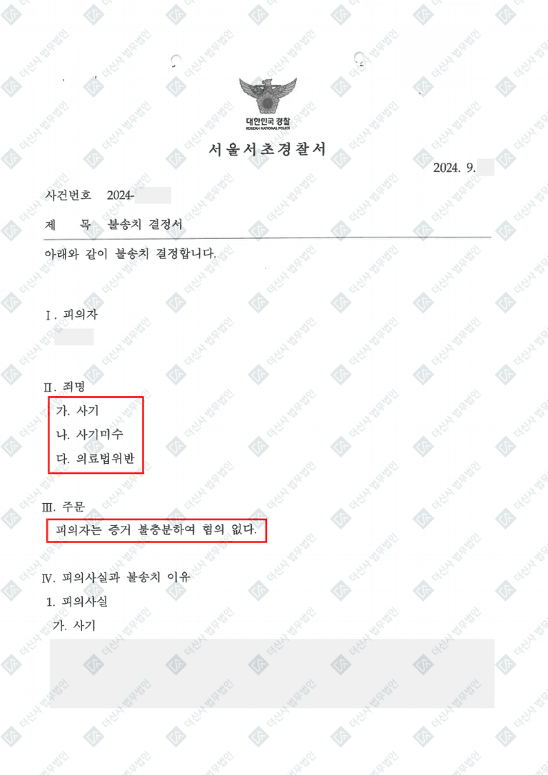 사안을 검토하였을 때, 환자의 주장에 대한 대응이 가능할 것으로 판단하였고, 혐의 전부에 대한 무혐의를 주장하기로 하였습니다. 의료법위반의 경우는 상대방이 주장하는 혐의에 대해 입증이 어려운 점을 강조하였고, 결국 의뢰인은 증거불충분으로 인한 혐의없음이라는 성공적인 결과를 받게 되었습니다.