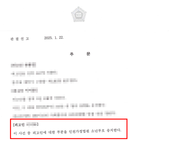 법원은 위와 같은 피고인의 정황을 참작하여, 공범자들 중에 유일하게 피고인만을 소년부 송치 결정함으로써 피고인은 소년법에 따른 보호처분을 받을 수 있게 되었습니다.