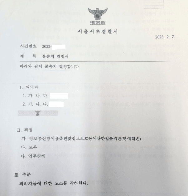 서울서초경찰서는 변호인의 의견을 수용하여 이 사건 범죄 혐의가 인정되지 않는다고 판단하여 이 사건 고소를 각하하였음(불송치 결정).