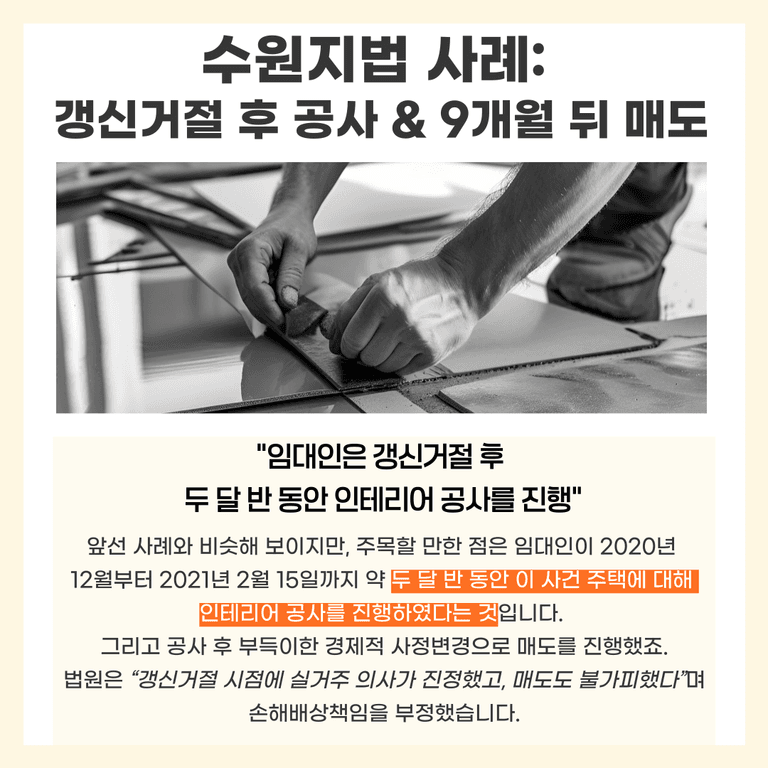실제로 공사를 진행했다는 ‘거주 준비행위’가 있었고, 매도 시점도 갱신거절 직후가 아니라 상당한 시간이 지난 뒤였기 때문이죠.