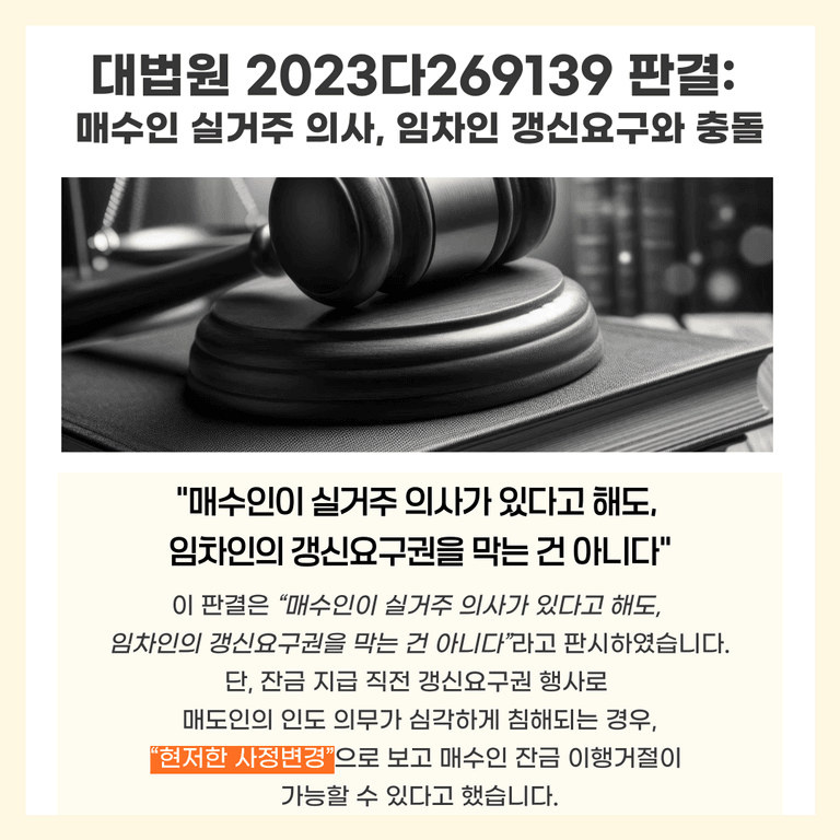 다만, 잔금 지급 직전에 임차인이 갑자기 갱신을 요구해서 매수인의 인도 의무가 현저히 침해되면, “현저한 사정변경”으로 볼 수도 있다고 했습니다(사건별로 판단).