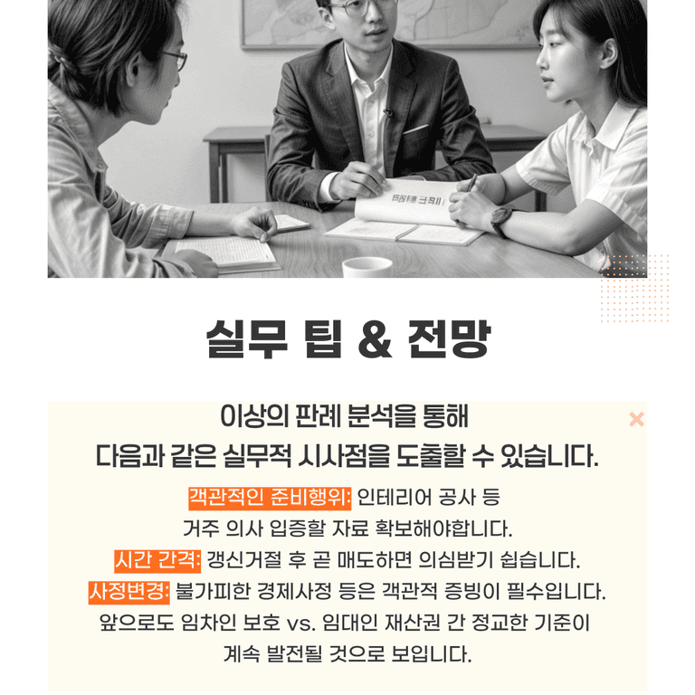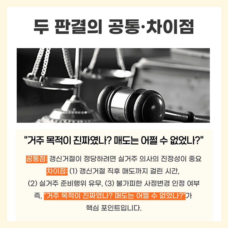 앞으로도 법원은 집주인과 세입자 사이의 사정(사실관계, 준비행위, 예상치 못한 변화 등)을 종합적으로 따져볼 텐데, 두 사례와 대법원 판결에서 볼 수 있듯이, 구체적으로 “얼마나 준비했나, 매도는 불가피했나”가 결정적입니다.