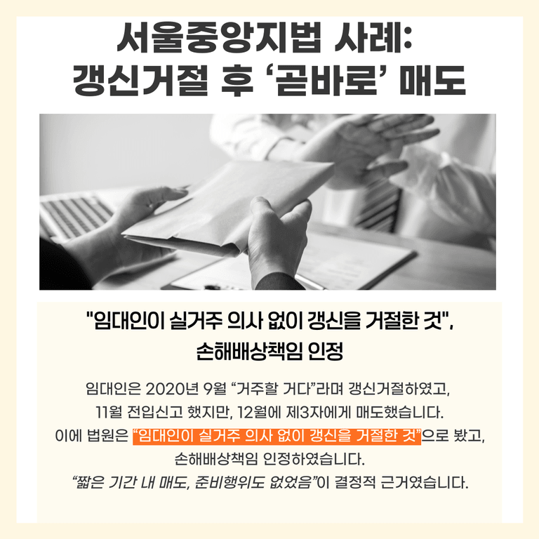 갱신거절하고 한두 달 만에 팔아버리면, “애초에 살 의사 없었지?”라는 의심을 받기 쉽습니다.