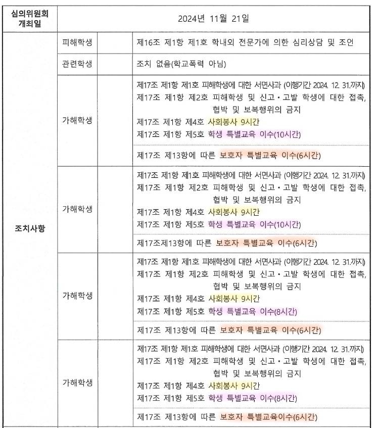 서울특별시성북강북교육지원청 학교폭력심의위원회에서 가해학생들에 대하여 제1호(서면사과), 제2호(보복금지), 제4호(사회 봉사), 제5호(가해자 특별 교육) 조치를 하였음.