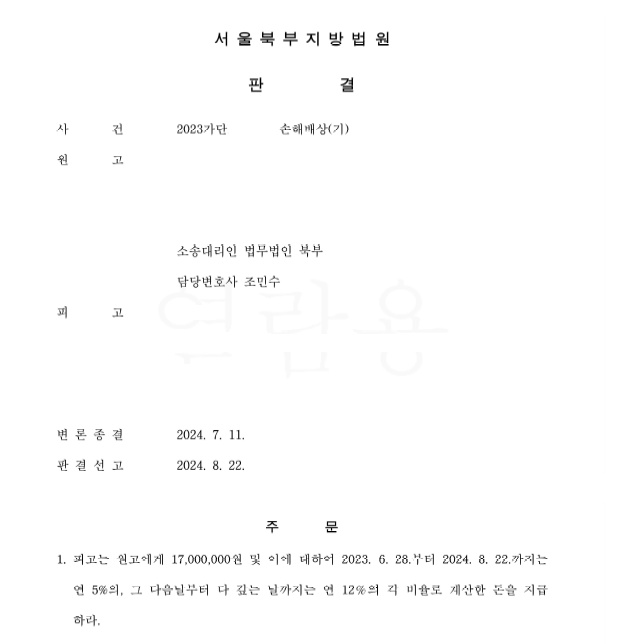 서울북부지방법원은 변호사의 의견을 받아들여, 위 상간으로 인한 손해배상 청구를 인용하면서 위자료로 1,700만원을 인정함.