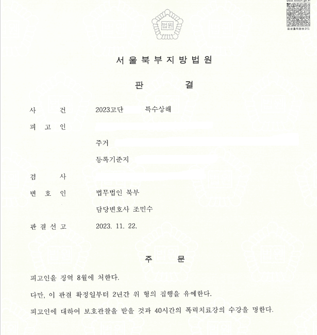 서울북부지방법원은 변호인의 의견을 수용하여 의뢰인에게 집행유예 판결을 선고하였음. 의뢰인이 양주병으로 피해자의 얼굴을 때린 행위는 자칫 큰 상해를 가할 수 있는 위험한 행위였던 점, 의뢰인은 이 사건 이외에도 다수의 동종 전과가 있었던 점, 특수상해는 벌금형이 없이 징역형만 있는 중범죄인 점을 고려할 때 변호인이 적절하게 피해자와 합의를 보지 않았더라면 실형이 선고되었을 가능성이 농후한 사건이었음. 변호인의 적절한 조력으로 의뢰인은 징역을 살지 않고 사회 경력을 유지할 수 있게 되었음.