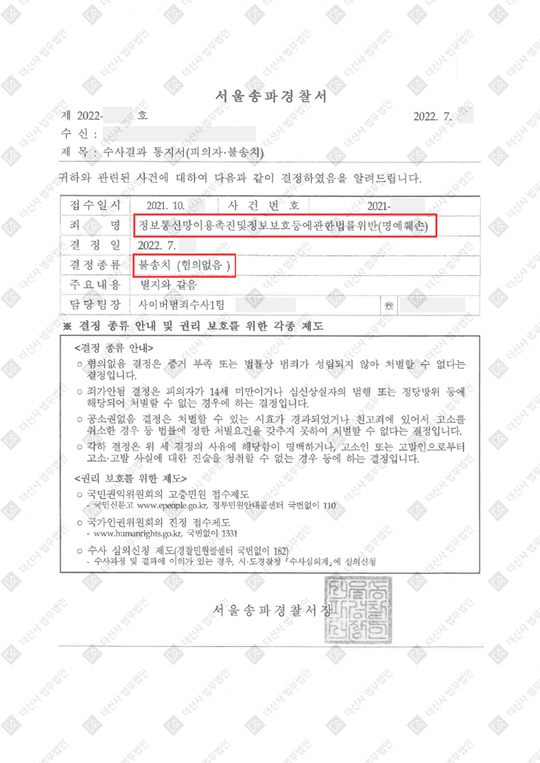 이에 저희는 경찰 조사 과정에서 의뢰인의 댓글이 공적 관심사에 대한 의견 개진이며, 단순한 비판적 견해를 표현한 것이라는 점을 강조하는 변호인의견서를 제출하였습니다. 결국 경찰 단계에서 명예훼손 혐의가 인정되지 않아 불송치 결정이 내려졌고, 의뢰인은 더 이상의 법적 문제 없이 사건을 마무리할 수 있었습니다.