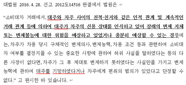 의뢰인 분의 보호를 위해 자세한 정황을 말씀드리기는 어렵지만, 일반론적으로 말씀드리면, 대법원은 기본적으로 “대주와 차주 사이의 친척, 친지와 같은 인적 관계 및 계속적인 거래 관계 등에 의하여 대주가 차주의 신용 상태를 인식하고 있어 장래의 변제 지체 또는 변제불능에 대한 위험을 예상하고 있었거나 충분히 예상할 수 있는 경우”에는 사기죄의 성립이 부정될 수 있다는 취지를 견지하고 있습니다.