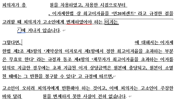 또한 오동현 변호사는 오히려 저희 의뢰인 분과 상대방이 당초 체결한 금전소비대차계약이 부적절하다는 점까지 지적하였습니다. 의뢰인 분과 지인 사이에서는 이자제한법상 최고이자율 이상의 이자를 약정하였는데, 이는 이자제한법에 위반하는 것이었기 때문입니다.