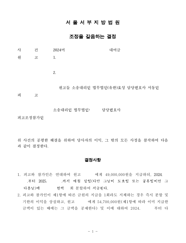 저는 즉각 피고를 상대로 민사소송 대여금청구 및 형사 사기고소를 하였고 법원은 조정에 회부한 후 피고의 가족을 조정참가인으로 하여 피고와 참가인이 연대하여 의뢰인들에게 대여금을 분납하는 내용의 강제조정을 하여 의뢰인들은 대여금을 변제받았습니다.