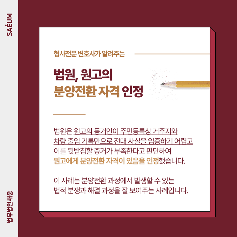그러나 이 과정에서 D사는 A씨가 선착순으로 입주했으며, 동거인 E가 거주하고 차량 등록 및 E씨의 거주지 초본이 다르다는 이유로 부적격 판정을 내렸습니다. 이에 따라 A씨는 이미 확정 임대가를 지급한 상태였음에도 불구하고 분양전환이 어려워지자 법무법인 새움에 법적 대응을 의뢰하게 되었습니다.