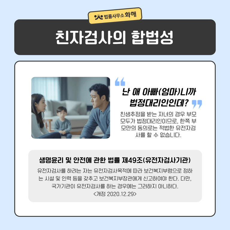 라고 생각하실 수 있습니다. 아이 아빠 혹은 아이 엄마는 법정대리인이니까 혼자서도 친자 검사를 할 수 있지 않을까요? 이는 잘못된 생각입니다. 친생추정을 받는 자녀의 경우 부모 모두가 법정대리인이므로, 한쪽 부모만의 동의로는 적법한 유전자 검사를 할 수 없습니다.
