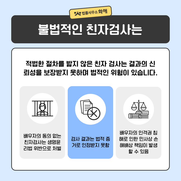 이렇듯 불법적인 절차나 부정확한 검사 결과는 심각한 법적, 경제적, 그리고 정서적 피해를 초래할 수 있습니다. 특히 위 사례에서는 잘못된 검사 결과로 인해 가정이 파탄나는 결과까지 이어졌는데요. 따라서 친자관계에 의문이 있다면 반드시 법적으로 인정된 절차를 통해 검사를 진행해야 합니다.