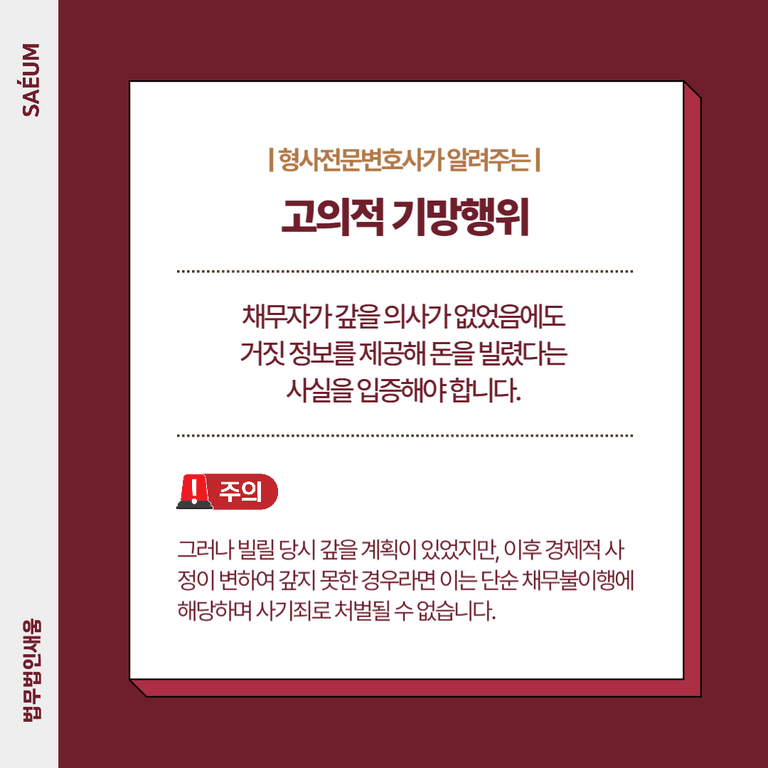그러나 빌릴 당시 갚을 계획이 있었지만, 이후 경제적 사정이 변하여 갚지 못한 경우라면 이는 단순 채무불이행에 해당하며 사기죄로 처벌될 수 없습니다.