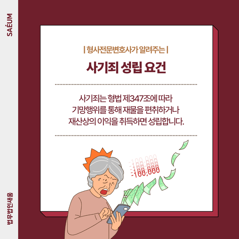 사기죄는 형법 제347조에 따라 기망(欺罔)행위를 통해 재물을 편취하거나 재산상의 이익을 취득하면 성립합니다. 핵심적인 성립 요건은 다음과 같습니다.