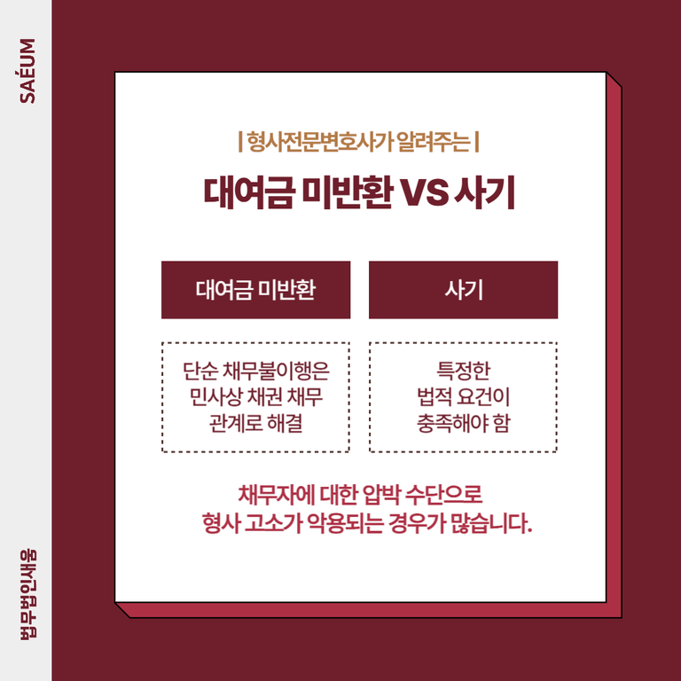 채무불이행이 곧바로 사기죄로 이어지는 것은 아닙니다. 하지만 채권자가 형사고소를 통해 압박을 가하는 경우 적절한 법적 대응을 하지 않으면 불리한 결과로 이어질 수 있습니다.