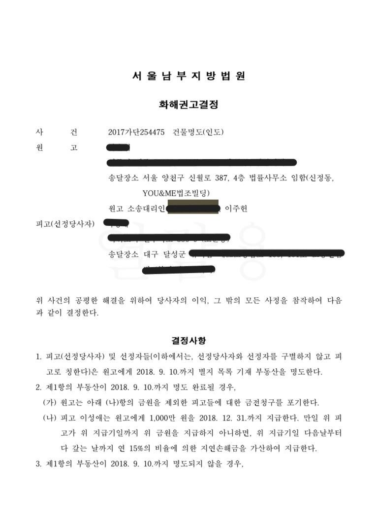 처음 강경하게 대응하던 상대방은 점차 의뢰인의 주장이 구체화 되자 태도를 바꾸어 조정에 임하게 되었고 상가로이어는 조정에서도 유리한 입장을 점하여 부동산 명도 및 일부 금전 지급과 부동산 명도 미완료시 추가 금전 지급 및 인도완료시까지 금전지급을 내용으로 하는 조정이 결정되었습니다.