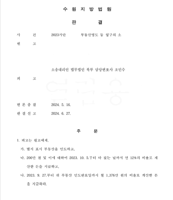 수원지방법원은 본 변호사의 의견을 그대로 수용하여 이 사건 모텔 건물의 명도 청구를 전부 인용하였음. 본 변호사의 적절한 조력으로 상대방의 악의적인 소송 지연을 막고, 신속하게 부동산 명도, 위약금, 지연 손해금까지 전부 인정될 수 있었음.