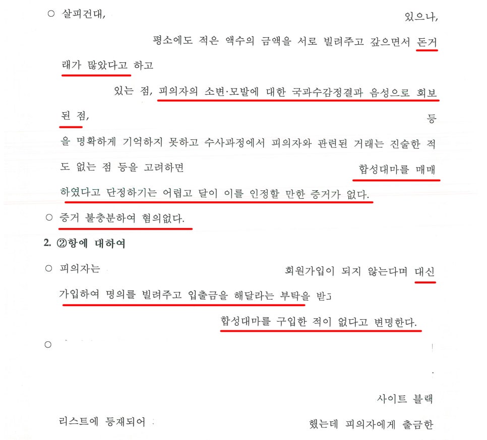이후 저는 A씨와 B씨가 주고받은 메시지 내용 등 여러 객관적인 자료를 바탕으로, A씨는 B씨에게 여러 차례 돈을 빌려주었다는 점, A씨는 소변 및 모발 검사에서 음성이 나왔다는 점, A씨는 B씨의 요청으로 인해 B씨를 대신하여 게임 사이트에 가입을 해준 뒤, B씨가 게임을 하도록 하였으며, B씨의 요청에 따라 B씨가 딴 게임 머니를 이체해 주었을 뿐이라는 점 등을 적극적으로 어필하며 'A씨는 B씨와 함께 합성대마를 매매한 사실이 전혀 없다'는 내용의 변호인의견서를 여러 차례 제출하였습니다.