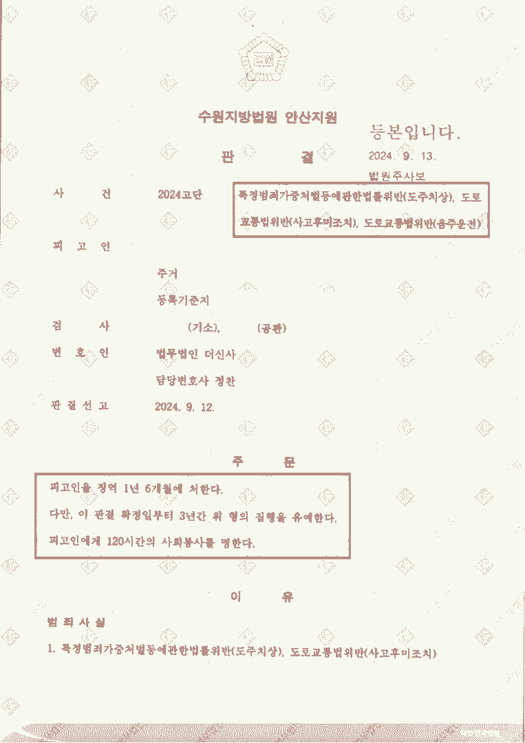 상대차가 택시였기에 운전자와 승객이 각각 전치 2주의 피해를 입은 상황이었습니다. 저희는 우선 당황한 의뢰인을 케어하며, 사건 당시의 cctv 와 목격자에 대한 검토를 통해 혐의의 심각성을 확인하고 최대한의 양형자료를 제출하였고, 피해자와의 합의도 진행하였습니다. 또한 진술에 대비하여 사전 시뮬레이션 진행을 통해 준비를 하였습니다. 다행히 의뢰인은 더신사 법무법인의 교통사고 전문 솔루션을 통해 집행유예라는 매우 성공적인 결과를 받게 되었습니다.