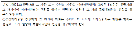 위와 같이 친권자와 미성년자 사이의 이해상반행위가 우려되는 경우 미성년자의 친권자나 후견인이 법원에 특별대리인 선임신청을 하여야 합니다.