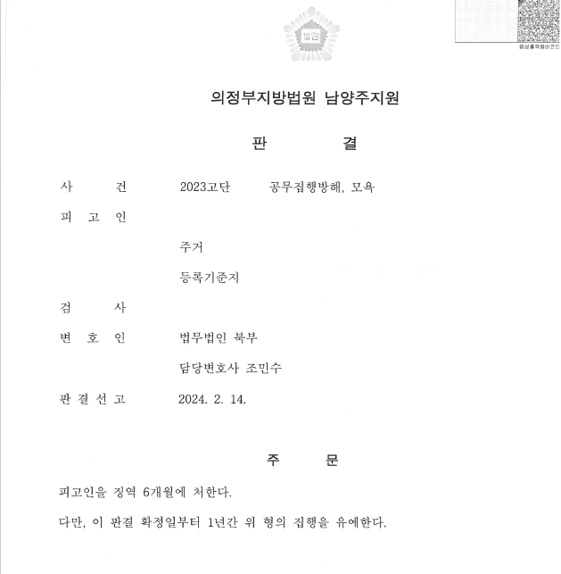 의정부지방법원 남양주지원은 변호인의 의견을 수용하여 실형이 아닌 집행유예 판결을 선고하였음.