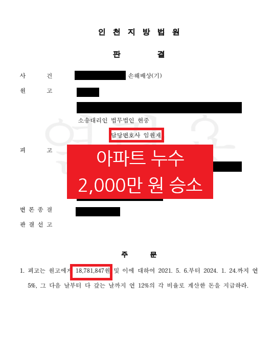 그 결과, 재판부는 입주자대표회의의 전적인 책임을 물어 보수공사 비용 등 총 1,800만 원의 손해배상금을 지급하라고 판결했습니다. 나아가, 단순 원금뿐만 아니라 지연 이자와 수백만 원에 달하는 법원 감정비용, 그리고 변호사 보수 등 소송 비용 일체까지 모두 상대방으로부터 받아내는 완벽한 승소를 거두었습니다.