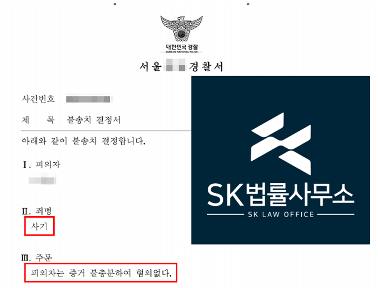 경찰은 본 변호인의 주장을 받아들여 사기 혐의에 대해 불송치(증거불충분) 결정하였습니다.이는 의뢰인이 과거 사기 전과가 있음에도 불구하고, 이번 사건이 고의적인 기망행위가 아닌 단순한 계약상 분쟁이라는 점을 입증하여 형사처벌을 피한 성공적인 변론 사례입니다.