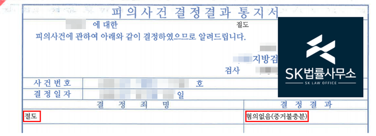 검찰은 본 변호인의 주장을 받아들여 절도 혐의에 대해 불기소(혐의없음) 결정하였습니다.SK 법률사무소의 강점