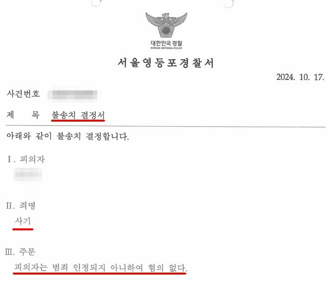 의뢰인은 경찰에서 범죄 인정되지 아니하여 혐의 없다는 무혐의 불송치 결정을 받았습니다.