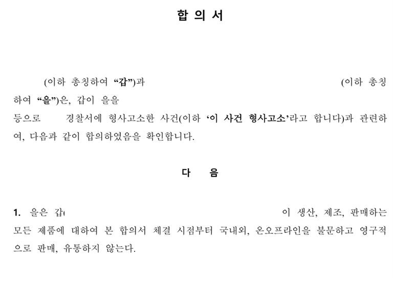 이에 저희가 상대방 리셀러에게 적극적인 합의에 의한 해결 의사를 밝히자, “영구적 판매중지 및 거액의 합의금”을 포함한 저희의 요구를 대부분 수용한 합의안을 바탕으로, 합의가 체결되었습니다.