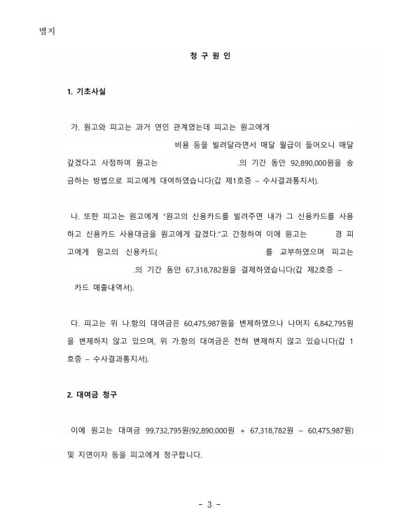의뢰인은 연인이었던 피고가 돈을 빌려주면 매달 갚겠다고 사정하여 장기간에 걸쳐 거액을 빌려주었으며, 피고가 의뢰인이 신용카드를 빌려주면 매달 신용카드 대금을 갚겠다고 사정하여 신용카드까지 교부하였는데, 피고는 일부를 변제하였으나 나머지를 변제하지 않고 잠적하여 저를 찾아오셨습니다.
