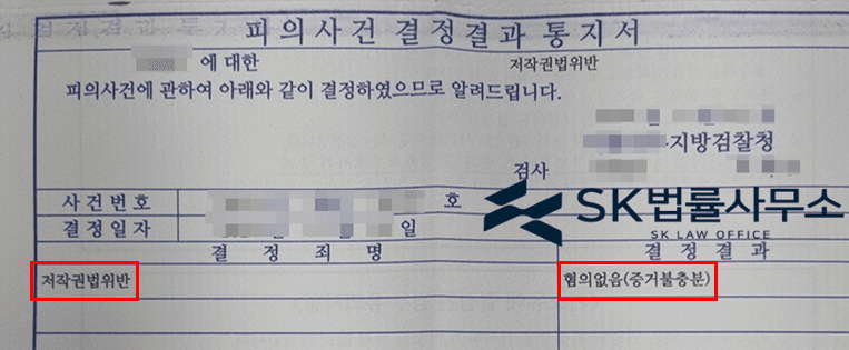 검찰은 본 변호인의 주장을 받아들여 저작권법위반 혐의에 대해 불기소 결정하였습니다.SK 법률사무소의 강점