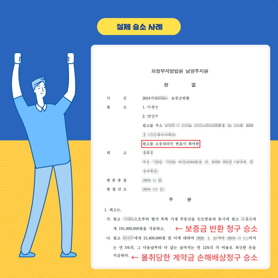 그럼 실제로 위와 같은 증거를 토대로 기존 집주인을 상대로, '보증금을 반환받지 못해 새로 이사할 집의 계약금을 몰취당했다'라고 손해배상을 청구하여 승소한 사례를 살펴보겠습니다.