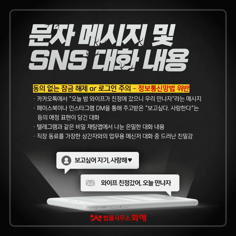 문자 메시지나 SNS 대화 내용은 상간 소송에서 정말 중요한 증거입니다. 배우자와 상간자가 주고받은 대화를 캡처해 두면 둘이 연인 사이라는 걸 가장 확실하게 보여줄 수 있기 때문인데요.