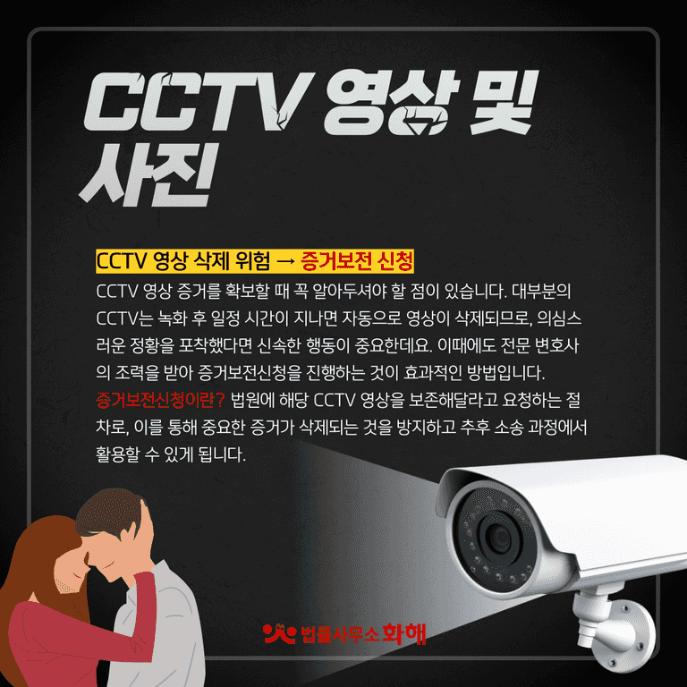 그러나 CCTV 영상 증거를 확보할 때 꼭 알아두셔야 할 점이 있습니다. 대부분의 CCTV는 녹화 후 일정 시간이 지나면 자동으로 영상이 삭제되므로, 의심스러운 정황을 포착했다면 신속한 행동이 중요한데요. 이때에도 전문 변호사의 조력을 받아 증거보전신청을 진행하는 것이 효과적인 방법입니다.