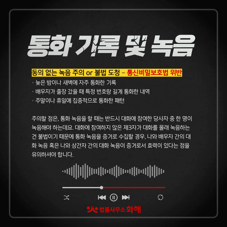 다만 주의할 점은, 통화 녹음을 할 때는 반드시 대화에 참여한 당사자 중 한 명이 녹음해야 하는데요. 대화에 참여하지 않은 제3자가 대화를 몰래 녹음하는 건 불법이기 때문에 통화 녹음을 증거로 수집할 경우, 나와 배우자 간의 대화 녹음 혹은 나와 상간자 간의 대화 녹음이 증거로서 효력이 있다는 점을 유의하셔야 할 것입니다.
