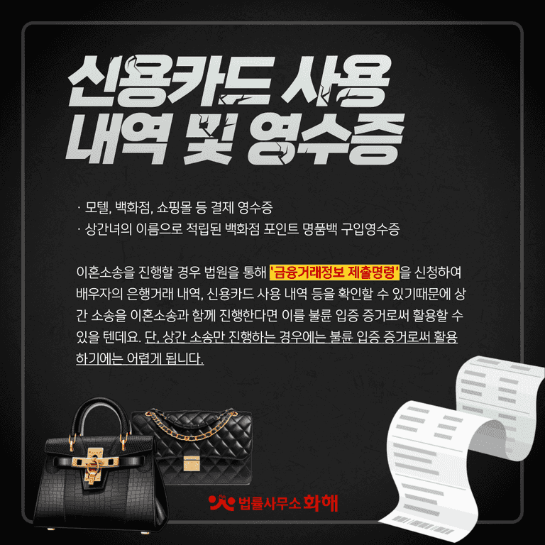 이혼소송을 진행할 경우 법원을 통해 ‘금융거래정보 제출명령’을 신청하여 배우자의 은행거래 내역, 신용카드 사용 내역 등을 확인할 수 있기때문에 상간 소송을 이혼소송과 함께 진행한다면 이를 불륜 입증 증거로써 활용할 수 있을 텐데요. 단, 상간 소송만 진행하는 경우에는 불륜 입증 증거로써 활용하기에는 어렵게 됩니다.